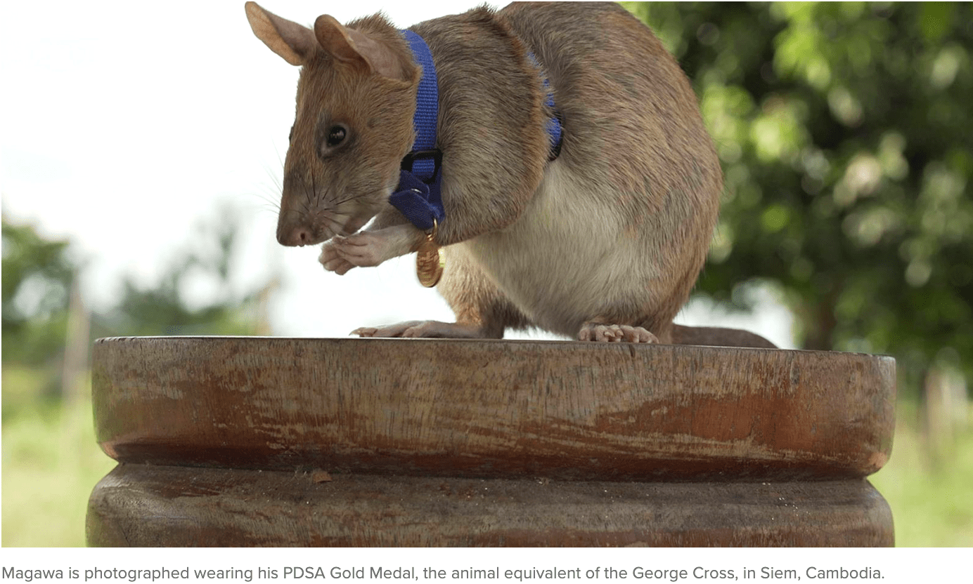 A rat has for the first time won a British charity’s top civilian award for animal bravery, receiving the honour for searching out unexploded landmines in Cambodia.